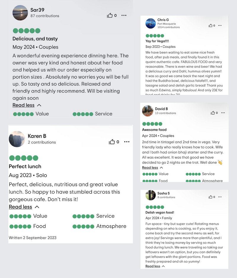 Vega has achieved the TripAdvisor Travelers’ Choice Award for the 2nd year running in 2023. Our 5 star reviews reflect the tasty homemade, international flavours of our menu and the cosy welcome of our cafe.